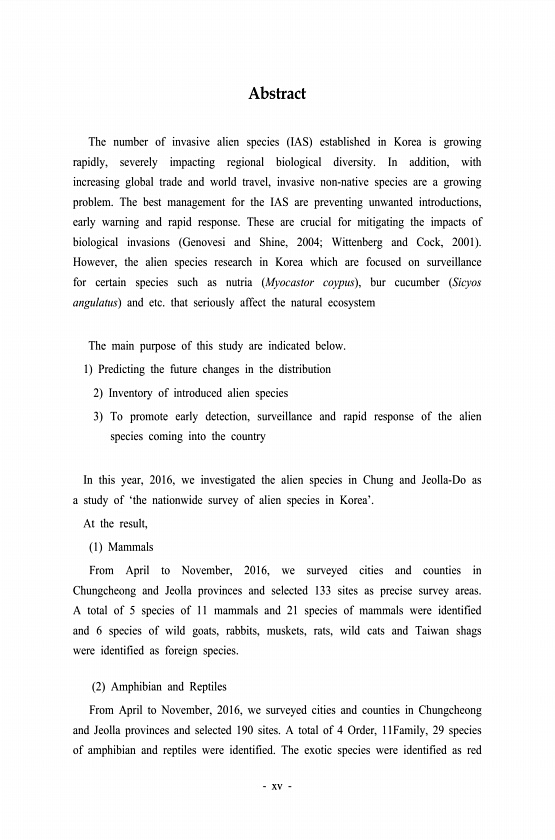 xv Abstract The number of invasive alien species IAS established in Korea is growing rapidly, severely impacting regional biological diversity. In addition, with increasing global trade and world travel, invasive non-native species are a growing problem. The best management for the IAS are preventing unwanted introductions, early warning and rapid response. These are crucial for mitigating the imp...