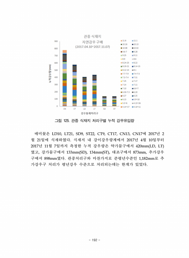 그림 125. 관중 식재지 처리구별 누적 강우유입량 매미꽃은 LD10, LT21, SD9, ST22, CT9, CT17, CN13, CN17에 2017년 2 월 21일에 식재하였다. 식재지 내 강이강우량계에서 2017년 4월 10일부터 2017년 11월 7일까지 측정한 누적 강우량은 약가뭄구에서 420mm LD, LT 였고, 강가뭄구에서 133mm SD , 134mm ST , 대조구에서 873mm, 추가강우 구에서 898mm였다. 관중처리구와 마찬가지로 준평년수준인 1,182mm로 추 가강우구 처리가 평년강우 수준으로 처리되는데는 한계가 있었다. 192
