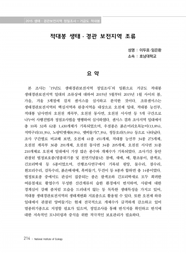 2015 생태·경관보전지역 정밀조사 거금도 적대봉 214 ? National Institute of Ecology 적대봉 생태·경관 보전지역 조류 성명 이두표·임은환 소속 호남대학교 요 약 본 조사는 ‘15년도 생태경관보전지역 정밀조사’의 일환으로 거금도 적대봉 생태경관보전지역 일대의 조류상에 대하여 2015년 5월부터 2015년 1월 사이의 봄, 가을, 겨울 3계절에 걸쳐 센서스를 실시하고 분석한 것이다. 조류센서스는 생태경관보전지역의 핵심지역과 완충지역을 대상으로 오천제 일대, 적대봉 능선부, 적대봉 남사면의 오천천 계곡부, 오천천 동사면, 오천천 서사면 등 5개 구간으로 나누어 사행진법과 정점조사법을 병행하여 실시하였다. 센서스 결과 조사지역 일대에서 총 10목 32과 62종 1,430개체가 기록되었으...