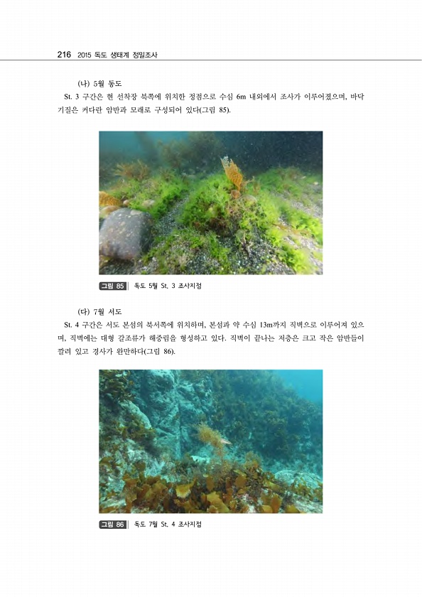 216 2015 독도 생태계 정밀조사 나 5월 동도 St. 3 구간은 현 선착장 북쪽에 위치한 정점으로 수심 6m 내외에서 조사가 이루어졌으며, 바닥 기질은 커다란 암반과 모래로 구성되어 있다 그림 85 그림 85 독도 5월 St. 3 조사지점 다 7월 서도 St. 4 구간은 서도 본섬의 북서쪽에 위치하며, 본섬과 약 수심 13m까지 직벽으로 이루어져 있으 며, 직벽에는 대형 갈조류가 해중림을 형성하고 있다. 직벽이 끝나는 저층은 크고 작은 암반들이 깔려 있고 경사가 완만하다 그림 86 그림 86 독도 7월 St. 4조사지점