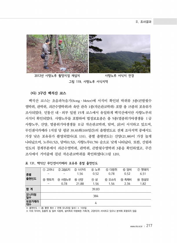 Ⅱ. 조사결과 www.nie.re.kr ? 217 2012년 사향노루 촬영지점 재설치 사향노루 서식지 전경 그림 119. 사향노루 서식지역 다 3구간 백석산 코스 백석산 코스는 초음파녹음기 SongMeter 에 서식이 확인된 박쥐류 3종 큰발윗수 염박쥐, 관박쥐, 쇠큰수염박쥐 과 육안 관측 1종 작은관코박쥐 포함 총 15종의 포유류가 조사되었다. 민통선 내·외부 일원 15개 코스에서 유일하게 백석산에서만 사향노루의 서식이 확인되었다. 사향노루를 포함하여 법정보호종은 총 5종 멸종위기야생생물 Ⅰ급 사향노루, 산양, 멸종위기야생생물 Ⅱ급 작은관코박쥐, 담비, 삵 이 서식하고 있으며, 무인센서카메라 1지점 당 평균 39.83회 100일간 의 출현빈도로 전체 조사지역 중에서도 가장 낮은 포유류가 촬영되었다 표 1...