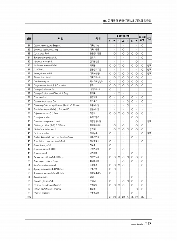 iii. 동강유역 생태·경관보전지역의 식물상 www.nie.re.kr ?213 번호 학 명 국 명 중점조사구역 중점외 1 2 3 4 5 6 7 지역 비고 21 Cuscuta pentagona Engelm. 미국실새삼 ○ 22 Ipomoea hederacea Jacq. 미국나팔꽃 ○ 23 I. purpurea Roth 둥근잎나팔꽃 ○ ○ ○ ○ ○ ○ 24 Symphytum officinale L. 컴프리 ○ 25 Veronica arvensis L. 선개불알풀 ○ 26 Ambrosia artemisiifolia L. 돼지풀 ○ ○ ○ ○ ○ ○ ○ 생교 27 A. trifida ...