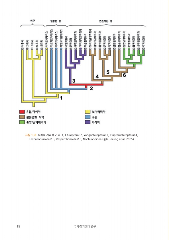 18 국가장기생태연구 그림 1. 8 박쥐의 지리적 기원. 1, Chiroptera; 2, Yangochiroptera; 3, Yinpterochiroptera; 4, Emballonuroidea; 5, Vespertilionoidea; 6, Noctilionoidea. 출처 Teeling et al. 2005