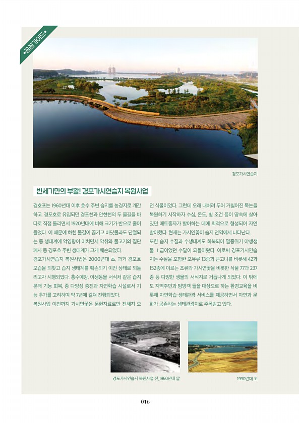 016 경호포는 1960년대 이후 호수 주변 습지를 농경지로 개간 하고, 경포호로 유입되던 경포천과 안현천의 두 물길을 바 다로 직접 돌리면서 1920년대에 비해 크기가 반으로 줄어 들었다. 이 때문에 하천 물길이 끊기고 바닷물과도 단절되 는 등 생태계에 악영향이 미치면서 악취와 물고기의 집단 폐사 등 경포호 주변 생태계가 크게 훼손되었다. 경포가시연습지 복원사업은 2000년대 초, 과거 경포호 모습을 되찾고 습지 생태계를 훼손되기 이전 상태로 되돌 리고자 시행되었다. 홍수예방, 야생동물 서식처 같은 습지 본래 기능 회복, 종 다양성 증진과 자연학습 시설로서 기 능 추가를 고려하며 약 7년에 걸쳐 진행되었다. 복원사업 이전까지 가시연꽃은 문헌자료로만 전해져 오 던 식물이었다. 그런데 오래 내버려 두어 거칠어...