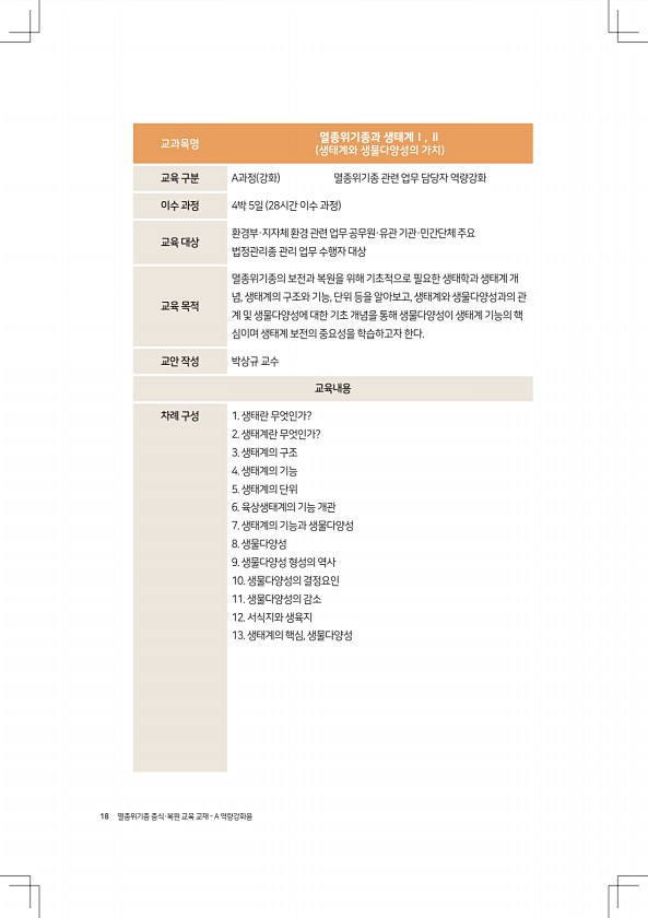 18 멸종위기종 증식·복원 교육 교재 A 역량강화용 교과목명 멸종위기종과 생태계Ⅰ, Ⅱ 생태계와 생물다양성의 가치 교육 구분 A과정 강화 멸종위기종 관련 업무 담당자 역량강화 이수 과정 4박 5일 28시간 이수 과정 교육 대상 환경부·지자체 환경 관련 업무 공무원·유관 기관·민간단체 주요 법정관리종 관리 업무 수행자 대상 교육 목적 멸종위기종의 보전과 복원을 위해 기초적으로 필요한 생태학과 생태계 개 념, 생태계의 구조와 기능, 단위 등을 알아보고, 생태계와 생물다양성과의 관 계 및 생물다양성에 대한 기초 개념을 통해 생물다양성이 생태계 기능의 핵 심이며 생태계 보전의 중요성을 학습하고자 한다. 교안 작성 박상규 교수 교육내용 차례 구성 1. 생태란 무엇인가? 2. 생태계란 무엇인가? 3. 생태계의 구조 4...