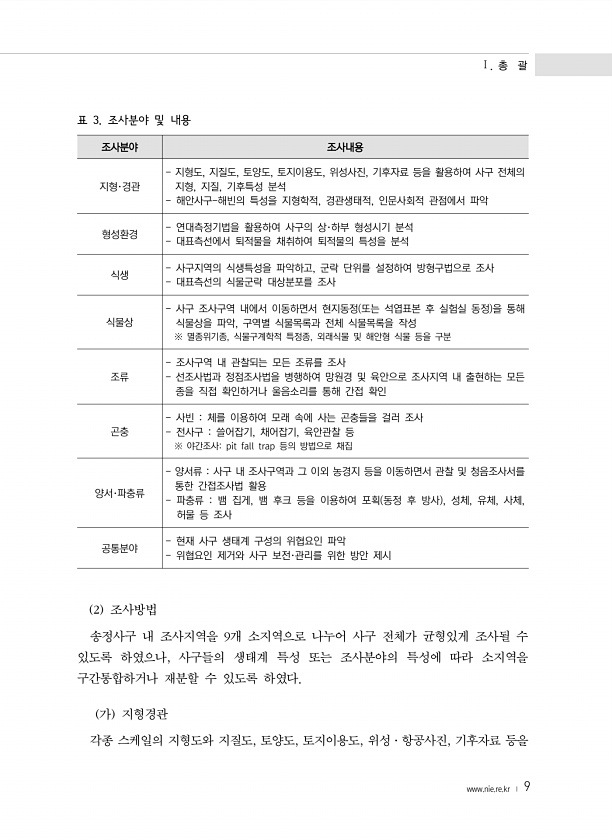 Ⅰ. 총 괄 www.nie.re.kr ? 9 조사분야 조사내용 지형·경관 지형도, 지질도, 토양도, 토지이용도, 위성사진, 기후자료 등을 활용하여 사구 전체의 지형, 지질, 기후특성 분석 해안사구-해빈의 특성을 지형학적, 경관생태적, 인문사회적 관점에서 파악 형성환경 연대측정기법을 활용하여 사구의 상·하부 형성시기 분석 대표측선에서 퇴적물을 채취하여 퇴적물의 특성을 분석 식생 사구지역의 식생특성을 파악하고, 군락 단위를 설정하여 방형구법으로 조사 대표측선의 식물군락 대상분포를 조사 식물상 사구 조사구역 내에서 이동하면서 현지동정 또는 석엽표본 후 실험실 동정 을 통해 식물상을 파악, 구역별 식물목록과 전체 식물목록을 작성 ※ 멸종위기종, 식물구계학적 특정종, 외래식물 및 해안형 식물 등을 구분 조류 조사구역...
