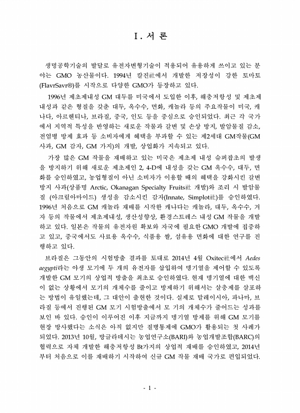 1 Ⅰ. 서 론 생명공학기술의 발달로 유전자변형기술이 적용되어 유용하게 쓰이고 있는 분 야는 GMO 농산물이다. 1994년 칼진社에서 개발한 저장성이 강한 토마토 FlavrSavr® 를 시작으로 다양한 GMO가 등장하고 있다. 1996년 제초제내성 GM 대두를 미국에서 도입한 이후, 해충저항성 및 제초제 내성과 같은 형질을 갖춘 대두, 옥수수, 면화, 캐놀라 등의 주요작물이 미국, 캐 나다, 아르헨티나, 브라질, 중국, 인도 등을 중심으로 승인되었다. 최근 각 국가 에서 지역적 특성을 반영하는 새로운 작물과 갈변 및 손상 방지, 발암물질 감소, 전염병 방제 효과 등 소비자에게 혜택을 부과할 수 있는 제2세대 GM작물 GM 사과, GM 감자, GM 가지 의 개발, 상업화가 지속되고 있다. 가장 많은 GM 작물...