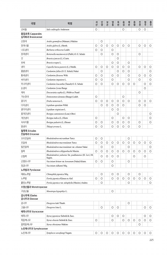 225 선버들 Salix subfragilis Andersson ○ ○ ○ ○ 풍접초목 Capparales 십자화과 Brassicaceae 산장대 Arabis gemmifera Matsum. Makino ○ 장대나물 Arabis glabra L. Bernh. ○ ○ ○ ○ ○ ○ ○ ○ ○ ○ 나도냉이 Barbarea orthoceras Ledeb. ○ ○ ○ 장대냉이 Berteroella maximowiczii Palib. O. E. Schulz ○ ○ ○ ○ 갓 Brassica juncea L. Czern. ○ 유채 Brassica napus L. ○ ○ ○ 냉이 Capsella bursa-pastoris L. Medik. ○ ○ ○ ○ ○ ○ ○ ○ ○ ○ 좁쌀냉이 Cardamine fallax O. ...
