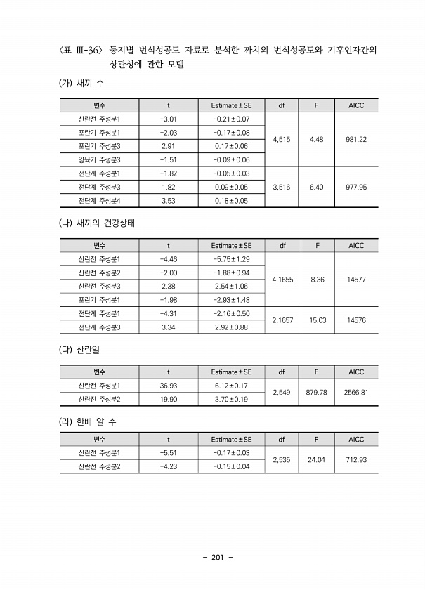 201 표 Ⅲ-36 둥지별 번식성공도 자료로 분석한 까치의 번식성공도와 기후인자간의 상관성에 관한 모델 가 새끼 수 변수 t Estimate±SE df F AICC 산란전 주성분1 -3.01 -0.21±0.07 4,515 4.48 981.22 포란기 주성분1 -2.03 -0.17±0.08 포란기 주성분3 2.91 0.17±0.06 양육기 주성분3 -1.51 -0.09±0.06 전단계 주성분1 -1.82 -0.05±0.03 전단계 주성분3 1.82 0.09±0.05 3,516 6.40 977.95 전단계 주성분4 3.53 0.18±0.05 나 새끼의 건강상태 변수 t Estimate±SE df F AICC 산란전 주성분1 -4.46 -5.75±1.29 4,1655 8.36 14577 산란전 주성분2 -2.00...