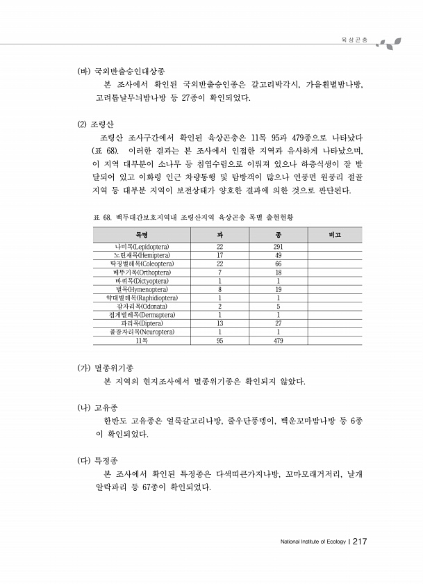 육 상 곤 충 National Institute of EcologyⅠ217 바 국외반출승인대상종 본 조사에서 확인된 국외반출승인종은 갈고리박각시, 가을흰별밤나방, 고려톱날무늬밤나방 등 27종이 확인되었다. 2 조령산 조령산 조사구간에서 확인된 육상곤충은 11목 95과 479종으로 나타났다 표 68 이러한 결과는 본 조사에서 인접한 지역과 유사하게 나타났으며, 이 지역 대부분이 소나무 등 침엽수림으로 이뤄져 있으나 하층식생이 잘 발 달되어 있고 이화령 인근 차량통행 및 탐방객이 많으나 연풍면 원풍리 절골 지역 등 대부분 지역이 보전상태가 양호한 결과에 의한 것으로 판단된다. 목명 과 종 비고 나비목 Lepidoptera 22 291 노린재목 Hemiptera 17 49 딱정벌레목 Coleoptera 22 66...