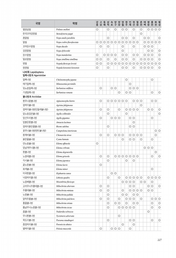 227 별쌍살벌 Polistes snelleni ○ ○ ○ ○ ○ ○ ○ ○ ○ ○ ○ 한국꼬마감탕벌 Stenodynerus pappi ○ 좀말벌 Vespa analis parallela ○ ○ ○ ○ ○ ○ ○ 말벌 Vespa crabro favofasciata ○ ○ ○ ○ ○ ○ ○ ○ ○ ○ ○ ○ ○ ○ ○ ○ ○ 꼬마장수말벌 Vespa ducalis ○ ○ ○ ○ ○ ○ ○ 검정말벌 Vespa dybowskii ○ ○ ○ ○ 장수말벌 Vespa mandarinia ○ ○ ○ ○ ○ ○ ○ ○ ○ ○ ○ ○ ○ 털보말벌 Vespa simillima simillima ○ ○ ○ ○ ○ ○ ○ ○ ○ ○ ○ ○ 땅벌 Vespula faviceps lewisii ○ ○ ○ ○ ○ ○ ○ ○ ○ ○ ○ ○...