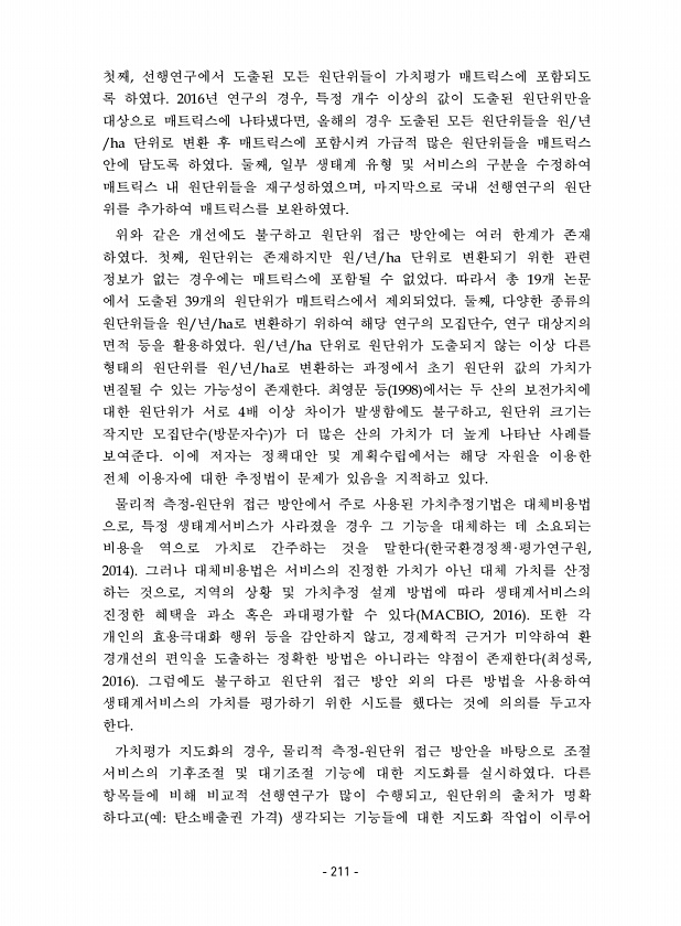 첫째, 선행연구에서 도출된 모든 원단위들이 가치평가 매트릭스에 포함되도 록 하였다. 2016년 연구의 경우, 특정 개수 이상의 값이 도출된 원단위만을 대상으로 매트릭스에 나타냈다면, 올해의 경우 도출된 모든 원단위들을 원/년 /ha 단위로 변환 후 매트릭스에 포함시켜 가급적 많은 원단위들을 매트릭스 안에 담도록 하였다. 둘째, 일부 생태계 유형 및 서비스의 구분을 수정하여 매트릭스 내 원단위들을 재구성하였으며, 마지막으로 국내 선행연구의 원단 위를 추가하여 매트릭스를 보완하였다. 위와 같은 개선에도 불구하고 원단위 접근 방안에는 여러 한계가 존재 하였다. 첫째, 원단위는 존재하지만 원/년/ha 단위로 변환되기 위한 관련 정보가 없는 경우에는 매트릭스에 포함될 수 없었다. 따라서 총 19개 논문 에서 도출된 ...