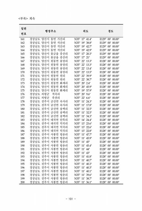부록 계속 일련 번호 행정주소 위도 경도 161 경상남도 양산시 동면 가산리 N35° 1741.4E129° 0000.00162 경상남도 양산시 동면 석산리 N35° 1938.8E129° 0000.00163 경상남도 양산시 동면 석산리 N35° 1942.7E129° 0000.00164 경상남도 양산시 동면 석산리 N35° 1942.9E129° 0000.00165 경상남도 양산시 물금읍 증산리 N35° 1720.3E129° 0000.00166 경상남도 양산시 물금읍 증산리 N35° 1721E129° 0000.00167 경상남도 양산시 원동면 용당리 N35° 2213.3E128° 0000.00168 경상남도 양산시 원동면 용당리 N35° 2213.3E128° 0000.00169 경상남도 양산시 원동면 용당리 N3...