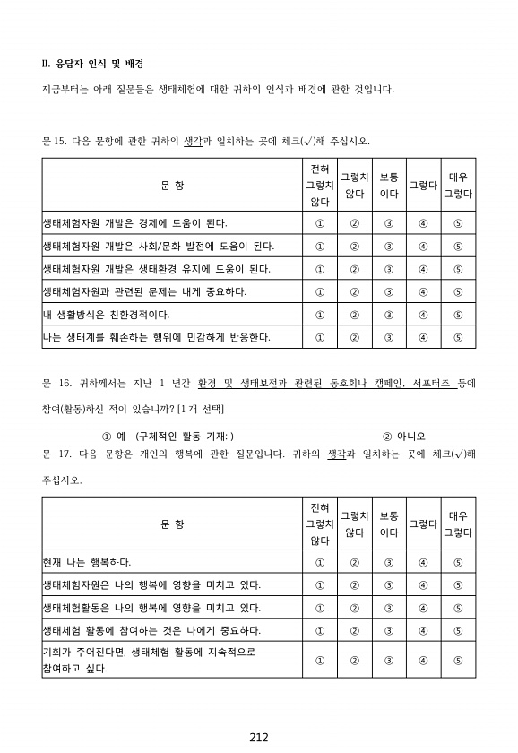 212 II. 응답자 인식 및 배경 지금부터는 아래 질문들은 생태체험에 대한 귀하의 인식과 배경에 관한 것입니다. 문 15. 다음 문항에 관한 귀하의 생각과 일치하는 곳에 체크 √ 해 주십시오. 문 16. 귀하께서는 지난 1 년간 환경 및 생태보전과 관련된 동호회나 캠페인, 서포터즈 등에 참여 활동 하신 적이 있습니까? [1 개 선택] 문 17. 다음 문항은 개인의 행복에 관한 질문입니다. 귀하의 생각과 일치하는 곳에 체크 √ 해 주십시오. 문 항 전혀 그렇치 않다 그렇치 않다 보통 이다 그렇다 매우 그렇다 생태체험자원 개발은 경제에 도움이 된다. ① ② ③ ④ ⑤ 생태체험자원 개발은 사회/문화 발전에 도움이 된다. ① ② ③ ④ ⑤ 생태체험자원 개발은 생태환경 유지에 도움이 된다. ① ② ③ ④ ⑤ 생태체...