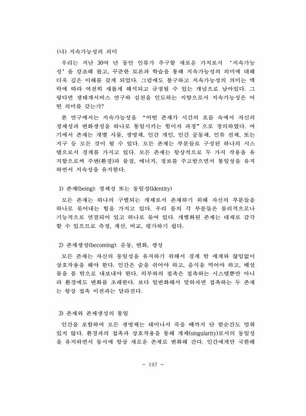 197 나 지속가능성의 의미 우리는 지난 30여 년 동안 인류가 추구할 새로운 가치로서 ‘지속가능 성’을 강조해 왔고, 꾸준한 토론과 학습을 통해 지속가능성의 의미에 대해 더욱 깊은 이해를 갖게 되었다. 그럼에도 불구하고 지속가능성의 의미는 맥 락에 따라 여전히 새롭게 해석되고 규정될 수 있는 개념으로 남아있다. 그 렇다면 생태계서비스 연구와 실천을 인도하는 지향으로서 지속가능성은 어 떤 의미를 갖는가? 본 연구에서는 지속가능성을 “어떤 존재가 시간의 흐름 속에서 자신의 정체성과 변화생성을 하나로 통일시키는 힘이자 과정”으로 정의하였다. 여 기에서 존재는 개별 사물, 생명체, 인간 개인, 인간 공동체, 인류 전체, 또는 지구 등 모든 것이 될 수 있다. 모든 존재는 부분들로 구성된 하나의 시스 템으로서 경계...