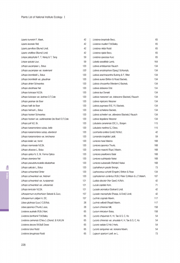 228 색인 Index Plants List of National Institute Ecology Ⅰ Liparis kumokiri F. Maek. 42 Liparis lacerata Ridl. 42 Liparis parviflora Blume Lindl. 42 Liparis viridiflora Blume Lindl. 42 Liriope platyphylla F. T. Wang & T. Tang 59 Liriope spicata Lour. 59 Lithops aucampiae L. Bolus 120 Lithops aucampiae var. koelemanii 120 Lithops bromfieldii L. Bolus 120 Lithops bromfieldii var. glaudinae 120 Lithops...