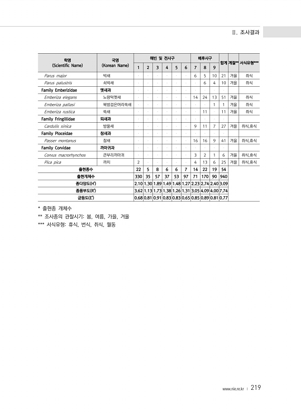 Ⅱ. 조사결과 www.nie.re.kr ? 219 학명 Scientific Name 국명 Korean Name 해빈 및 전사구 배후사구 합계 계절** 서식유형*** 1 2 3 4 5 6 7 8 9 Parus major 박새 6 5 10 21 겨을 취식 Parus palustris 쇠박새 6 4 10 겨을 취식 Family Emberizidae 멧새과 Emberiza elegans 노랑턱멧새 14 24 13 51 겨을 취식 Emberiza pallasi 북방검은머리쑥새 1 1 겨을 취식 Emberiza rustica 쑥새 11 11 겨을 취식 Family Fringillidae 되새과 ...