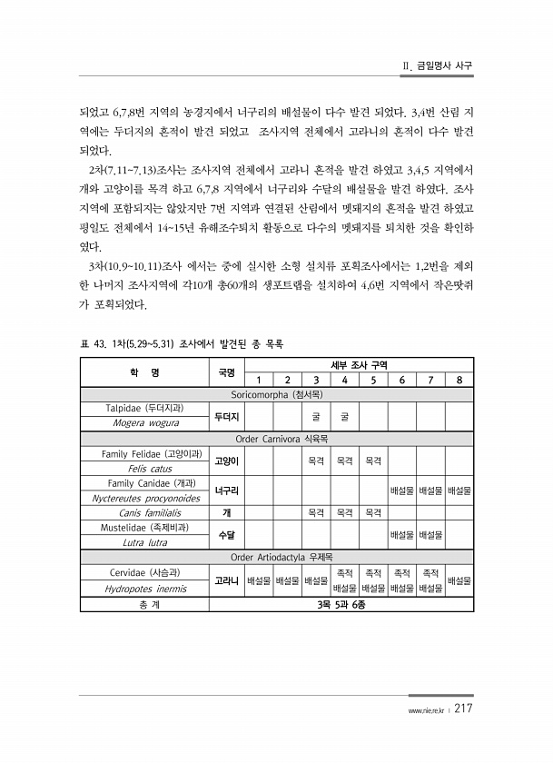 Ⅱ. 금일명사 사구 www.nie.re.kr ? 217 되었고 6,7,8번 지역의 농경지에서 너구리의 배설물이 다수 발견 되었다. 3,4번 산림 지 역에는 두더지의 흔적이 발견 되었고 조사지역 전체에서 고라니의 흔적이 다수 발견 되었다. 2차 7.117.13 조사는 조사지역 전체에서 고라니 흔적을 발견 하였고 3,4,5 지역에서 개와 고양이를 목격 하고 6,7,8 지역에서 너구리와 수달의 배설물을 발견 하였다. 조사 지역에 포함되지는 않았지만 7번 지역과 연결된 산림에서 멧돼지의 흔적을 발견 하였고 평일도 전체에서 1415년 유해조수퇴치 활동으로 다수의 멧돼지를 퇴치한 것을 확인하 였다. 3차 10.910.11 조사 에서는 중에 실시한 소형 설치류 포획조사에서는 1,2번을 제외 한 나머지 조사지역에 각10개...