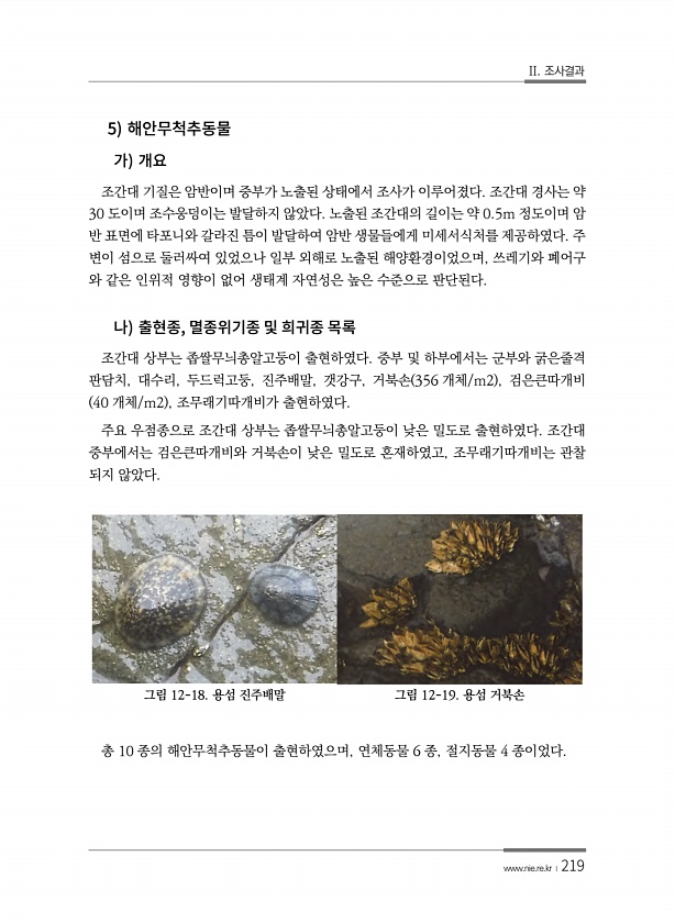 II. 조사결과 www.nie.re.kr ?219 5 조간대 기질은 암반이며 중부가 노출된 상태에서 조사가 이루어졌다. 조간대 경사는 약 30 도이며 조수웅덩이는 발달하지 않았다. 노출된 조간대의 길이는 약 0.5m 정도이며 암 반 표면에 타포니와 갈라진 틈이 발달하여 암반 생물들에게 미세서식처를 제공하였다. 주 변이 섬으로 둘러싸여 있었으나 일부 외해로 노출된 해양환경이었으며, 쓰레기와 폐어구 와 같은 인위적 영향이 없어 생태계 자연성은 높은 수준으로 판단된다. , 조간대 상부는 좁쌀무늬총알고둥이 출현하였다. 중부 및 하부에서는 군부와 굵은줄격 판담치, 대수리, 두드럭고둥, 진주배말, 갯강구, 거북손 356 개체/m2 , 검은큰따개비 40 개체/m2 , 조무래기따개비가 출현하였다. 주요 우점종으로 조간대 ...