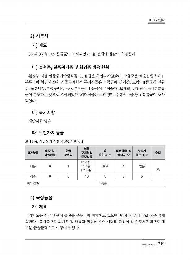 II. 조사결과 www.nie.re.kr ?219 3 53 과 93 속 109 분류군이 조사되었다. 섬 전체에 곰솔이 우점한다. , 환경부 지정 멸종위기야생식물 Ⅰ, Ⅱ급은 확인되지않았다. 고유종은 백운산원추리 1 분류군이 확인되었다. 식물구계학적 특정식물은 Ⅲ등급에 산기장, 모람, Ⅱ등급에 진황 정, 돌뽕나무, 다정큼나무 등 3 분류군, Ⅰ등급에 옥녀꽃대, 모새달, 큰천남성 등 17 분류 군이 분포하는 것으로 조사되었다. 외래식물은 소리쟁이, 주홍서나물 등 4 분류군이 조사 되었다. 해당사항 없음 평가항목 멸종위기 야생생물 한국 고유종 식물 구계학적 특정식물 총 출현종 수 외래식물 및 식재종 수 서식지 훼손 정도 총점 내용 0 1 Ⅲ2 종 Ⅱ3 종 Ⅰ17 종 109 4 없음 28 점수 0 5 10 5 3 ...