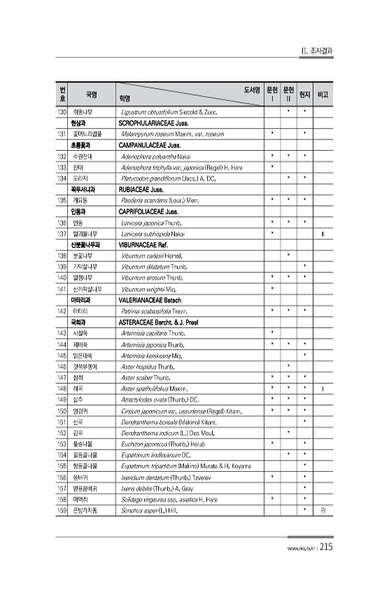 II. 조사결과 www.nie.re.kr ?215 번 호 국명 도서명 학명 문헌 Ⅰ 문헌 Ⅱ 현지 비고 130 쥐똥나무 Ligustrum obtusifolium Siebold & Zucc. * * 현삼과 SCROPHULARIACEAE Juss. 131 꽃며느리밥풀 Melampyrum roseum Maxim. var. roseum * * 초롱꽃과 CAMPANULACEAE Juss. 132 수원잔대 Adenophora polyantha Nakai * * * 133 잔대 Adenophora triphylla var. japonica Regel H. Hara * 134 도라지 Platycodon grandiflorum Jacq. A. DC. * * 꼭두서니과 RUBIACEAE Juss. 135 계요등 Paederi...