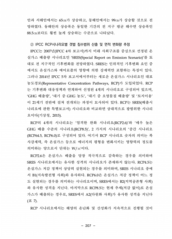 207 안과 서해안에서는 65㎝가 상승하고, 동해안에서는 99㎝가 상승할 것으로 전 망하였다. 동해안의 상승폭은 동일한 기간의 전 지구 평균 해수면 상승폭인 88.5㎝보다도 훨씬 높게 상승하는 수준으로 나타났다. ② IPCC RCP시나리오별 갯벌 침수범위 산출 및 면적 변화량 추정 IPCC는 2007년 IPCC 4차 보고서 까지 미래 사회구조를 중심으로 선정된 온 실가스 배출량 시나리오인 ‘SRES Special Report on Emission Scenario ’를 토 대로 전 지구적인 기후변화를 전망하였다. SRES는 인위적인 기후변화 요인 중 에서도 온실가스와 에어로졸의 영향에 의한 강제력만 포함하는 특징이 있다. 그러나 2014년 IPCC 5차 보고서에서부터는 새로운 온실가스 시나리오인 대표 농도경로...