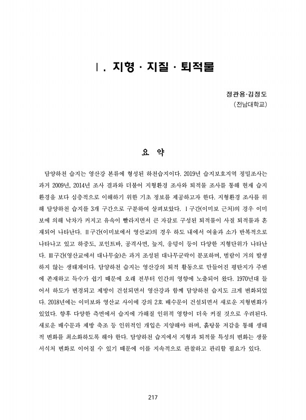 217 Ⅰ. 지형·지질·퇴적물 정관용·김정도 전남대학교 요 약 담양하천 습지는 영산강 본류에 형성된 하천습지이다. 2019년 습지보호지역 정밀조사는 과거 2009년, 2014년 조사 결과와 더불어 지형환경 조사와 퇴적물 조사를 통해 현재 습지 환경을 보다 심층적으로 이해하기 위한 기초 정보를 제공하고자 한다. 지형환경 조사를 위 해 담양하천 습지를 3개 구간으로 구분하여 살펴보았다. Ⅰ구간 이미보 근처 의 경우 이미 보에 의해 낙차가 커지고 유속이 빨라지면서 큰 자갈로 구성된 퇴적물이 사질 퇴적물과 혼 재되어 나타난다. Ⅱ구간 이미보에서 영산교 의 경우 하도 내에서 여울과 소가 반복적으로 나타나고 있고 하중도, 포인트바, 공격사면, 늪지, 웅덩이 등이 다양한 지형단위가 나타난 다. Ⅲ구간 영산교에서 대나무숲...