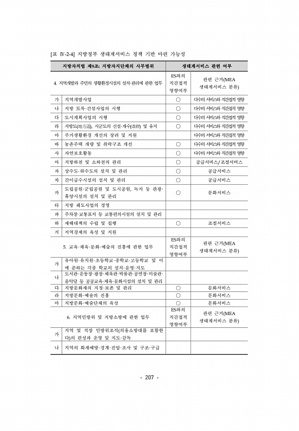 207 지방자치법 제9조지방자지단체의 사무범위 생태계서비스 관련 여부 4. 지역개발과 주민의 생활환경시설의 설치·관리에 관한 업무 ES와의 직간접적 영향여부 관련 근거 MEA 생태계서비스 분류 가 지역개발사업 ? 다수의 서비스와 직간접적 영향 나 지방 토목·건설사업의 시행 ? 다수의 서비스와 직간접적 영향 다 도시계획사업의 시행 ? 다수의 서비스와 직간접적 영향 라 지방도 地方道 , 시군도의 신설·개수 改修 및 유지 ? 다수의 서비스와 직간접적 영향 마 주거생활환경 개선의 장려 및 지원 다수의 서비스와 직간접적 영향 바 농촌주택 개량 및 취락구조 개선 ? 다수의 서비스와 직간접적 영향 사 자연보호활동 ? 다수의 서비스와 직간접적 영향 아 지방하천 및 소하천의 관리 ? 공급서비스/조절서비스 자 상수도·하수도의...