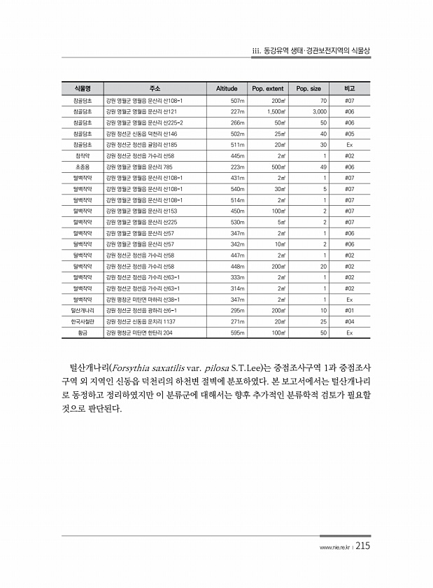 iii. 동강유역 생태·경관보전지역의 식물상 www.nie.re.kr ?215 털산개나리 Forsythia saxatilis var. pilosa S.T.Lee 는 중점조사구역 1과 중점조사 구역 외 지역인 신동읍 덕천리의 하천변 절벽에 분포하였다. 본 보고서에서는 털산개나리 로 동정하고 정리하였지만 이 분류군에 대해서는 향후 추가적인 분류학적 검토가 필요할 것으로 판단된다. 식물명 주소 Altitude Pop. extent Pop. size 비고 참골담초 강원 영월군 영월읍 문산리 산108-1 507m 200㎡ 70 #07 참골담초 강원 영월군 영월읍 문산리 산121 227m 1,500㎡ 3,000 #06 참골담초 강원 영월군 영월읍 문산리 산225-2 266m 50㎡ 50 #06 참골담초 강원 정선군 신...