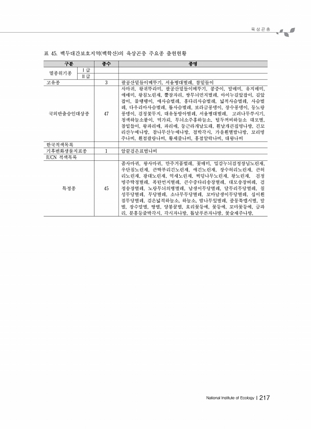 육 상 곤 충 National Institute of EcologyⅠ217 구분 종수 종명 멸종위기종 Ⅰ급 Ⅱ급 고유종 3 팔공산밑들이메뚜기, 서울병대벌레, 참밑들이 국외반출승인대상종 47 사마귀, 왕귀뚜라미, 팔공산밑들이메뚜기, 콩중이, 말매미, 유지매미, 애매미, 왕침노린재, 뿔잠자리, 쌍무늬먼지벌레, 아이누길앞잡이, 길앞 잡이, 물땡땡이, 애사슴벌레, 홍다리사슴벌레, 넓적사슴벌레, 사슴벌 레, 다우리아사슴벌레, 톱사슴벌레, 보라금풍뎅이, 장수풍뎅이, 등노랑 풍뎅이, 검정꽃무지, 대유동방아벌레, 서울병대벌레, 고려나무쑤시기, 청색하늘소붙이, 먹가뢰, 무늬소주홍하늘소, 털두꺼비하늘소 대모벌, 참밑들이, 왕파리매, 파리매, 둥근라개날도래, 흰날개큰집명나방, 긴꼬 리산누에나방, 참나무산누에나방, 점박각시, 가...