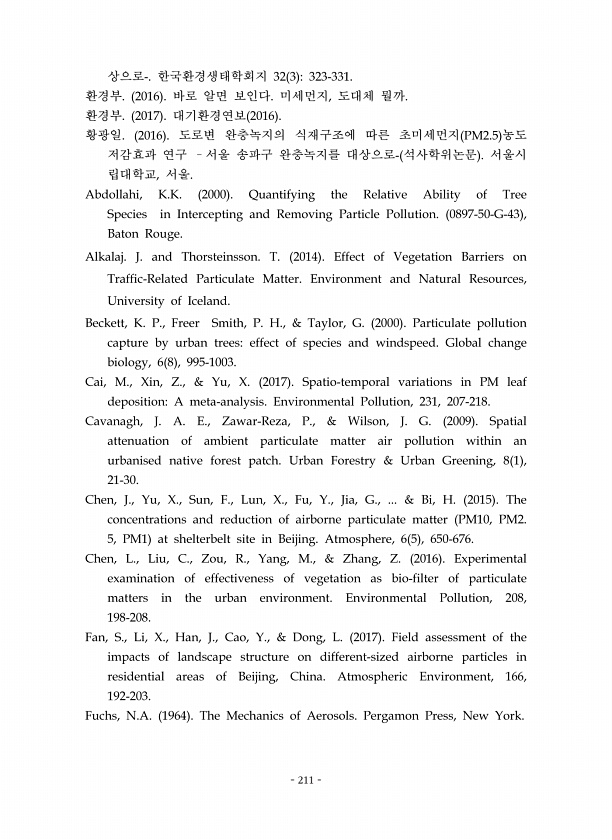 211 상으로 한국환경생태학회지 환경부 바로 알면 보인다 미세먼지 도대체 뭘까 환경부 대기환경연보 황광일 도로변 완충녹지의 식재구조에 따른 초미세먼지 농도 저감효과 연구 서울 송파구 완충녹지를 대상으로 석사학위논문 서울시 립대학교 서울 211