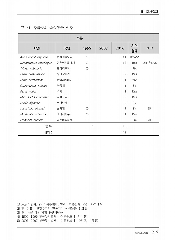 Ⅱ. 조사결과 www.nie.re.kr ? 219 표 34. 황죽도의 육상동물 현황 조류 학명 국명 1999 2007 2016 서식 형태 비고 Anas poecilorhyncha 흰뺨검둥오리 ○ 11 Res/WV Haematopus ostralegus 검은머리물떼새 ○ 14 Res 멸Ⅱ 천 제326 Tringa nebularia 청다리도요 ○ PM Larus crassirostris 괭이갈매기 7 Res Larus cachinnans 한국재갈매기 1 WV Caprimulgus indicus 쏙독새 1 SV Parus major 박새 2 Res Microscelis amaurotis 직박구리 2 Res Cettia diphone 휘파람새 3 SV Locustella pleskei 섬개개비 ○ 1 SV 멸Ⅱ M...