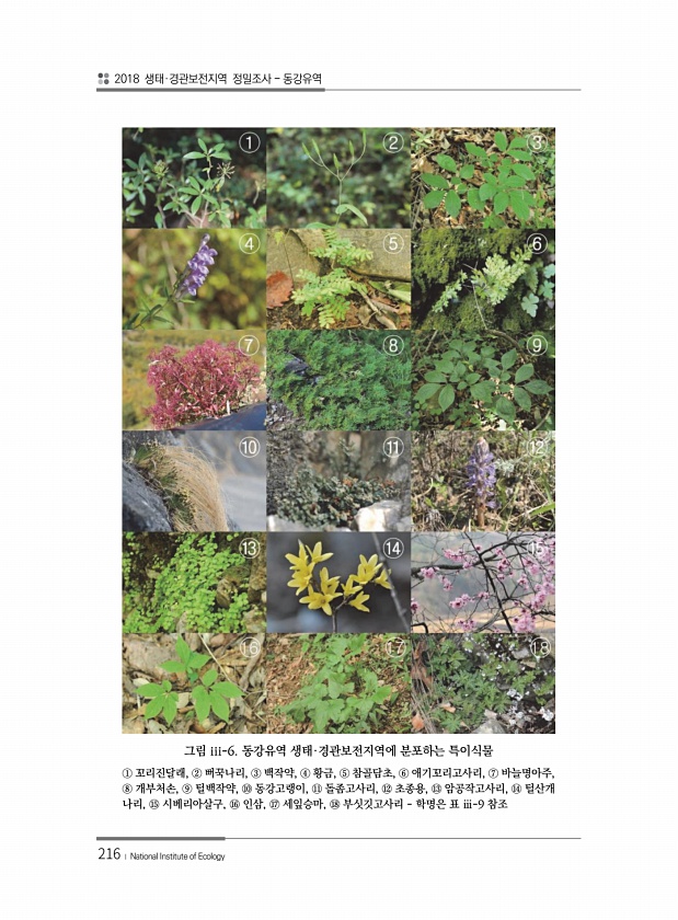 2018 생태·경관보전지역 정밀조사 동강유역 216 ? National Institute of Ecology 그림 iii-6. 동강유역 생태·경관보전지역에 분포하는 특이식물 ① 꼬리진달래, ② 뻐꾹나리, ③ 백작약, ④ 황금, ⑤ 참골담초, ⑥ 애기꼬리고사리, ⑦ 바늘명아주, ⑧ 개부처손, ⑨ 털백작약, ⑩ 동강고랭이, ⑪ 돌좀고사리, ⑫ 초종용, ⑬ 암공작고사리, ⑭ 털산개 나리, ⑮ 시베리아살구, ? 인삼, ? 세잎승마, ? 부싯깃고사리 학명은 표 ⅲ-9참조