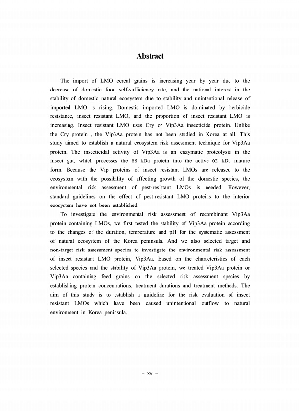 xv Abstract The import of LMO cereal grains is increasing year by year due to the decrease of domestic food self-sufficiency rate, and the national interest in the stability of domestic natural ecosystem due to stability and unintentional release of imported LMO is rising. Domestic imported LMO is dominated by herbicide resistance, insect resistant LMO, and the proportion of insect resistant LMO i...