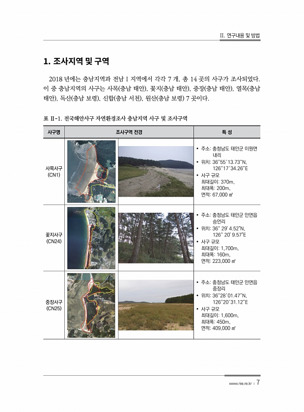 II. 연구내용 및 방법 www.nie.re.kr ? 7 1. 2018 년에는 충남지역과 전남 I 지역에서 각각 7 개, 총 14 곳의 사구가 조사되었다. 이 중 충남지역의 사구는 사목 충남 태안 , 꽃지 충남 태안 , 중장 충남 태안 , 열목 충남 태안 , 독산 충남 보령 , 신합 충남 서천 , 원산 충남 보령 7 곳이다. 사구명 조사구역 전경 특 성 사목사구 CN1 ? 주소충청남도 태안군 이원면 내리 ? 위치36°55′13.73″N, 126°17′34.26″E ? 사구 규모 최대길이370m, 최대폭200m, 면적67,000 ㎡ 꽃지사구 CN24 ? 주소충청남도 태안군 안면읍 승언리 ? 위치36° 294.52N, 126° 209.57E ? 사구 규모 최대길이1,700m, 최대폭160m, 면적223,000 ...
