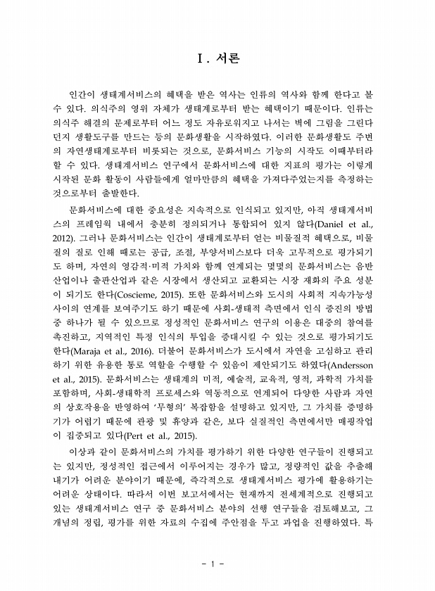 1 서론 인간이 생태계서비스의 혜택을 받은 역사는 인류의 역사와 함께 한다고 볼 수 있다 의식주의 영위 자체가 생태계로부터 받는 혜택이기 때문이다 인류는 의식주 해결의 문제로부터 어느 정도 자유로워지고 나서는 벽에 그림을 그린다 던지 생활도구를 만드는 등의 문화생활을 시작하였다 이러한 문화생활도 주변 의 자연생태계로부터 비롯되는 것으로 문화서비스 기능의 시작도 이때부터라 할 수 있다 생태계서비스 연구에서 문화서비스에 대한 지표의 평가는 이렇게 시작된 문화 활동이 사람들에게 얼마만큼의 혜택을 가져다주었는지를 측정하는 것으로부터 출발한다 문화서비스에 대한 중요성은 지속적으로 인식되고 있지만 아직 생태계서비 스의 프레임웍 내에서 충분히 정의되거나 통합되어 있지 않다 그러나 문화서비스는 인간이 생태계로부터 얻는 비...