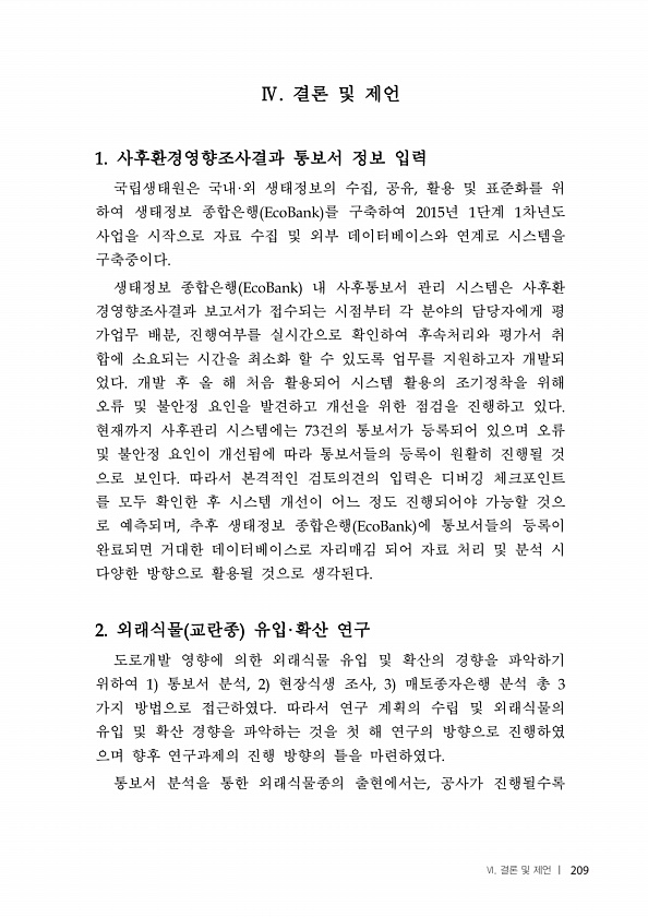 결론 및 제언 사후환경영향조사결과 통보서 정보 입력 국립생태원은 국내 외 생태정보의 수집 공유 활용 및 표준화를 위 하여 생태정보 종합은행 를 구축하여 년 단계 차년도 사업을 시작으로 자료 수집 및 외부 데이터베이스와 연계로 시스템을 구축중이다 생태정보 종합은행 내 사후통보서 관리 시스템은 사후환 경영향조사결과 보고서가 접수되는 시점부터 각 분야의 담당자에게 평 가업무 배분 진행여부를 실시간으로 확인하여 후속처리와 평가서 취 합에 소요되는 시간을 최소화 할 수 있도록 업무를 지원하고자 개발되 었다 개발 후 올 해 처음 활용되어 시스템 활용의 조기정착을 위해 오류 및 불안정 요인을 발견하고 개선을 위한 점검을 진행하고 있다 현재까지 사후관리 시스템에는 건의 통보서가 등록되어 있으며 오류 및 불안정 요인이 개선...