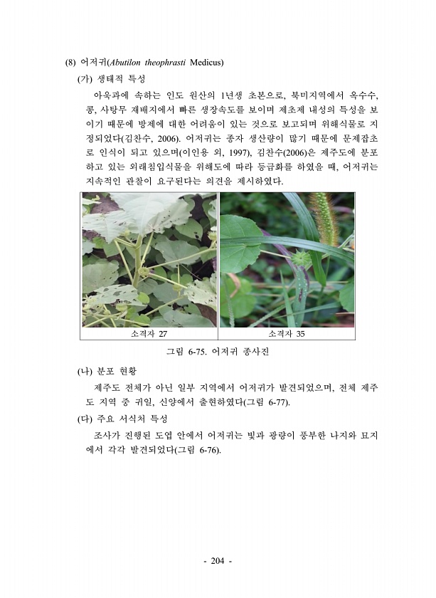 204 8 어저귀 Abutilon theophrasti Medicus 가 생태적 특성 아욱과에 속하는 인도 원산의 1년생 초본으로, 북미지역에서 옥수수, 콩, 사탕무 재배지에서 빠른 생장속도를 보이며 제초제 내성의 특성을 보 이기 때문에 방제에 대한 어려움이 있는 것으로 보고되며 위해식물로 지 정되었다 김찬수, 2006 어저귀는 종자 생산량이 많기 때문에 문제잡초 로 인식이 되고 있으며 이인용 외, 1997 , 김찬수 2006 은 제주도에 분포 하고 있는 외래침입식물을 위해도에 따라 등급화를 하였을 때, 어저귀는 지속적인 관찰이 요구된다는 의견을 제시하였다. 소격자 27 소격자 35 그림 6-75. 어저귀 종사진 나 분포 현황 제주도 전체가 아닌 일부 지역에서 어저귀가 발견되었으며, 전체 제주 도 지역 중 ...