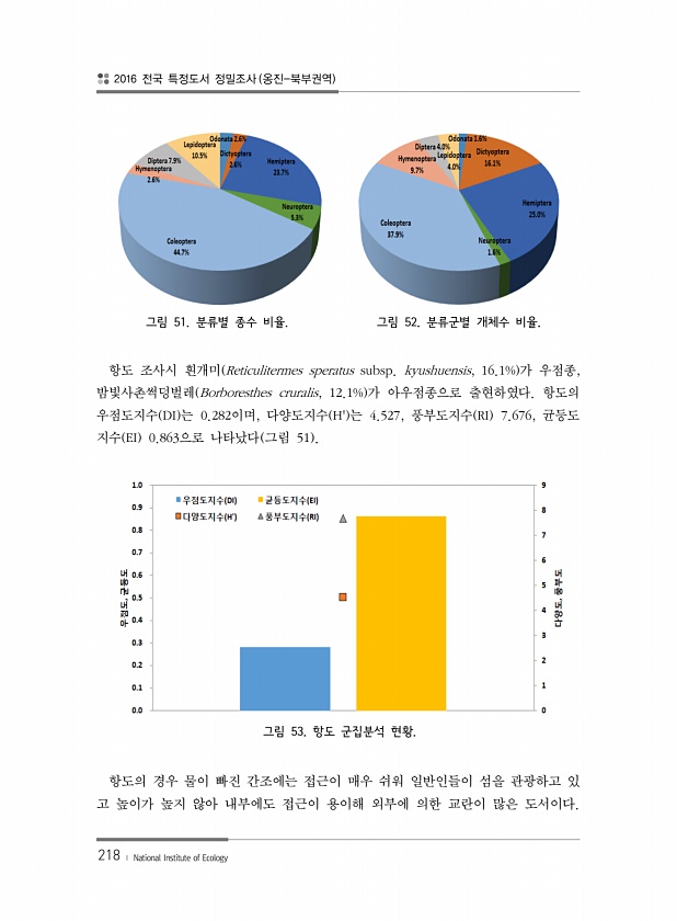 2016 전국 특정도서 정밀조사 옹진-북부권역 218 ? National Institute of Ecology 그림 51. 분류별 종수 비율. 그림 52. 분류군별 개체수 비율. 항도 조사시 흰개미 Reticulitermes speratus subsp. kyushuensis, 16.1% 가 우점종, 밤빛사촌썩덩벌레 Borboresthes cruralis, 12.1% 가 아우점종으로 출현하였다. 항도의 우점도지수 DI 는 0.282이며, 다양도지수 H는 4.527, 풍부도지수 RI 7.676, 균등도 지수 EI 0.863으로 나타났다 그림 51 그림 53. 항도 군집분석 현황. 항도의 경우 물이 빠진 간조에는 접근이 매우 쉬워 일반인들이 섬을 관광하고 있 고 높이가 높지 않아 내부에도 접근이 용이해 외부에 의...