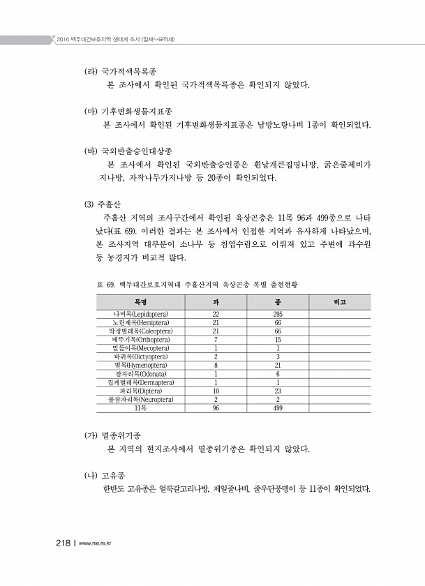 2016 백두대간보호지역 생태계 조사 밀재묘적재 218Ⅰwww.nie.re.kr 라 국가적색목록종 본 조사에서 확인된 국가적색목록종은 확인되지 않았다. 마 기후변화생물지표종 본 조사에서 확인된 기후변화생물지표종은 남방노랑나비 1종이 확인되었다. 바 국외반출승인대상종 본 조사에서 확인된 국외반출승인종은 흰날개큰집명나방, 굵은줄제비가 지나방, 자작나무가지나방 등 20종이 확인되었다. 3 주흘산 주흘산 지역의 조사구간에서 확인된 육상곤충은 11목 96과 499종으로 나타 났다 표 69 이러한 결과는 본 조사에서 인접한 지역과 유사하게 나타났으며, 본 조사지역 대부분이 소나무 등 침엽수림으로 이뤄져 있고 주변에 과수원 등 농경지가 비교적 많다. 목명 과 종 비고 나비목 Lepidoptera 22 295 노린재목 H...