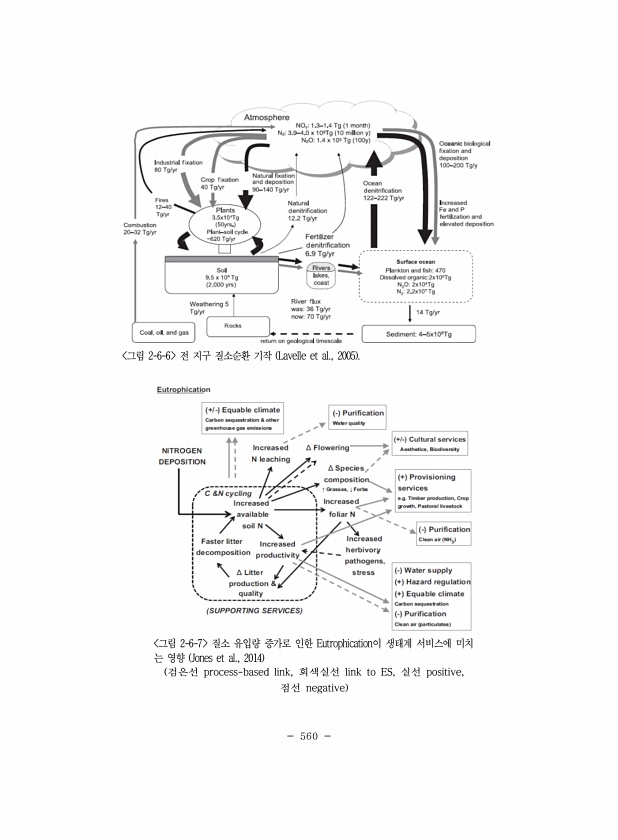 560 그림 2-6-6 전 지구 질소순환 기작 Lavelle et al., 2005 그림 2-6-7 질소 유입량 증가로 인한 Eutrophication이 생태계 서비스에 미치 는 영향 Jones et al., 2014 검은선 process-based link, 회색실선 link to ES, 실선 positive, 점선 negative
