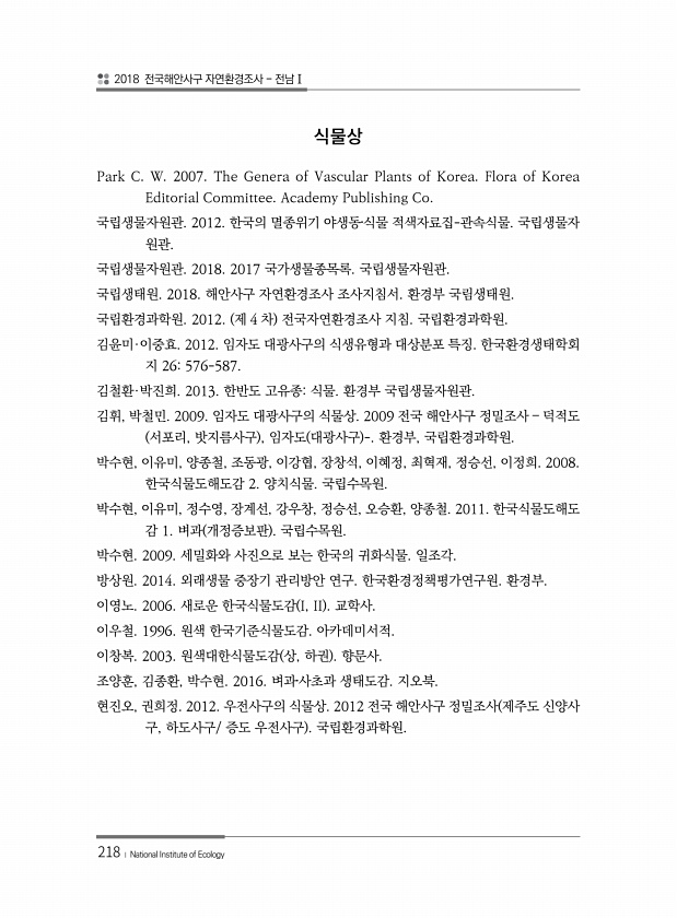 2018 전국해안사구 자연환경조사 전남Ⅰ 218 ? National Institute of Ecology Park C. W. 2007. The Genera of Vascular Plants of Korea. Flora of Korea Editorial Committee. Academy Publishing Co. 국립생물자원관. 2012. 한국의 멸종위기 야생동?식물 적색자료집-관속식물. 국립생물자 원관. 국립생물자원관. 2018. 2017 국가생물종목록. 국립생물자원관. 국립생태원. 2018. 해안사구 자연환경조사 조사지침서. 환경부 국림생태원. 국립환경과학원. 2012. 제 4 차 전국자연환경조사 지침. 국립환경과학원. 김윤미·이중효. 2012. 임자도 대광사구의 식생유형과 대상분포 특징. 한국환경생태학회...