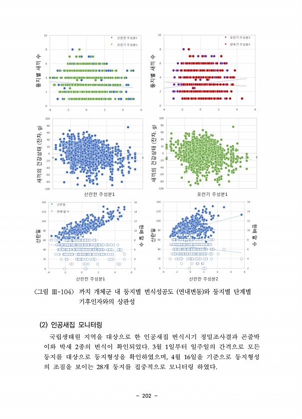 202 그림 Ⅲ-104 까치 개체군 내 둥지별 번식성공도 연내변동 와 둥지별 단계별 기후인자와의 상관성 2 인공새집 모니터링 국립생태원 지역을 대상으로 한 인공새집 번식시기 정밀조사결과 곤줄박 이와 박새 2종의 번식이 확인되었다. 3월 1일부터 일주일의 간격으로 모든 둥지를 대상으로 둥지형성을 확인하였으며, 4월 16일을 기준으로 둥지형성 의 조짐을 보이는 28개 둥지를 집중적으로 모니터링하였다.