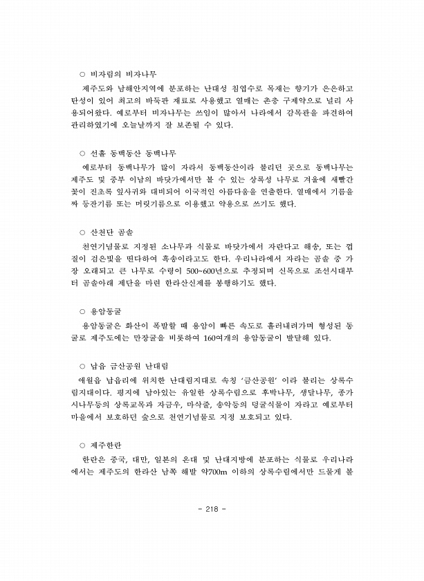 218 비자림의 비자나무 제주도와 남해안지역에 분포하는 난대성 침엽수로 목재는 향기가 은은하고 탄성이 있어 최고의 바둑판 재료로 사용했고 열매는 촌충 구제약으로 널리 사 용되어왔다 예로부터 비자나무는 쓰임이 많아서 나라에서 감목관을 파견하여 관리하였기에 오늘날까지 잘 보존될 수 있다 선흘 동백동산 동백나무 예로부터 동백나무가 많이 자라서 동백동산이라 불리던 곳으로 동백나무는 제주도 및 중부 이남의 바닷가에서만 볼 수 있는 상록성 나무로 겨울에 새빨간 꽃이 진초록 잎사귀와 대비되어 이국적인 아름다움을 연출한다 열매에서 기름을 짜 등잔기름 또는 머릿기름으로 이용했고 약용으로 쓰기도 했다 산천단 곰솔 천연기념물로 지정된 소나무과 식물로 바닷가에서 자란다고 해송 또는 껍 질이 검은빛을 띤다하여 흑송이라고도 한다 우...