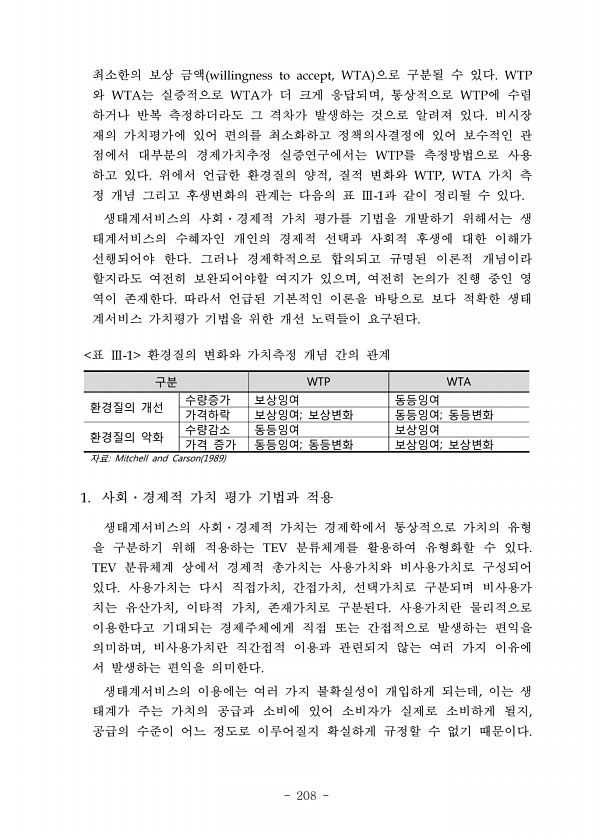 208 최소한의 보상 금액 으로 구분될 수 있다 와 는 실증적으로 가 더 크게 응답되며 통상적으로 에 수렴 하거나 반복 측정하더라도 그 격차가 발생하는 것으로 알려져 있다 비시장 재의 가치평가에 있어 편의를 최소화하고 정책의사결정에 있어 보수적인 관 점에서 대부분의 경제가치추정 실증연구에서는 를 측정방법으로 사용 하고 있다 위에서 언급한 환경질의 양적 질적 변화와 가치 측 정 개념 그리고 후생변화의 관계는 다음의 표 과 같이 정리될 수 있다 생태계서비스의 사회 경제적 가치 평가를 기법을 개발하기 위해서는 생 태계서비스의 수혜자인 개인의 경제적 선택과 사회적 후생에 대한 이해가 선행되어야 한다 그러나 경제학적으로 합의되고 규명된 이론적 개념이라 할지라도 여전히 보완되어야할 여지가 있으며 여전히 논의가 진행 중...
