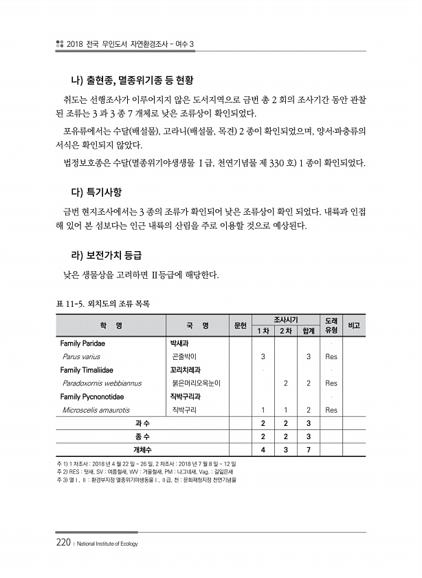 2018 전국 무인도서 자연환경조사 여수 3 220 ? National Institute of Ecology , 취도는 선행조사가 이루어지지 않은 도서지역으로 금번 총 2 회의 조사기간 동안 관찰 된 조류는 3 과 3 종 7 개체로 낮은 조류상이 확인되었다. 포유류에서는 수달 배설물 , 고라니 배설물, 목견 2 종이 확인되었으며, 양서?파충류의 서식은 확인되지 않았다. 법정보호종은 수달 멸종위기야생생물 Ⅰ급, 천연기념물 제 330 호 1 종이 확인되었다. 금번 현지조사에서는 3 종의 조류가 확인되어 낮은 조류상이 확인 되었다. 내륙과 인접 해 있어 본 섬보다는 인근 내륙의 산림을 주로 이용할 것으로 예상된다. 낮은 생물상을 고려하면 Ⅱ등급에 해당한다. 학 명 국 명 문헌 조사시기 도래 1 차 2 차 합계 유...