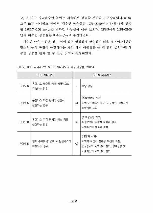 208 고, 전 지구 평균해수면 높이는 계속해서 상승할 것이라고 전망하였다 표 8 모든 RCP 시나리오 하에서, 해수면 상승률은 19712010년 기간에 대해 관측 된 2.0[1.72.3] ㎜/yr을 초과할 가능성이 매우 높으며, CP8.5에서 20812100 년의 해수면 상승률은 816㎜/yr로 추정하였다. 해수면 상승 수준은 전 지역에 걸쳐 일정하게 상승하지 않을 것이며, 이산화 탄소의 누적 총량이 동일하다는 가정 하에 배출량을 좀 더 빨리 줄인다면 해 수면 상승을 완화 할 수 있을 것으로 전망하였다. RCP 시나리오 SRES 시나리오 RCP2.6 온실가스 배출을 당장 적극적으로 감축하는 경우 · 해당 없음 RCP4.5 온실가스 저감 정책이 상당히 실현되는 경우 B1 지속발전형 사회 지역 간 격차가 적고...