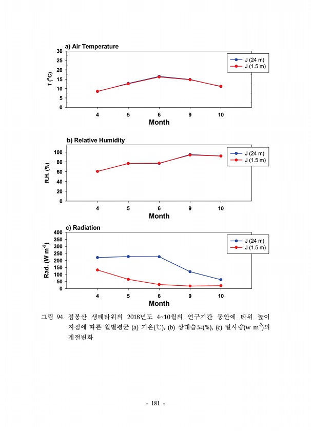 181 a Air Temperature Month 4 5 6 9 10 T oC 5 0 10 15 20 25 30 J 24 m J 1.5 m c Radiation Month 4 5 6 9 10 Rad. W m-2 0 50 100 150 200 250 300 350 400 J 24 m J 1.5 m b Relative Humidity Month 4 5 6 9 10 R.H. % 0 20 40 60 80 100 J 24 m J 1.5 m 그림 94. 점봉산 생태타워의 2018년도 410월의 연구기간 동안에 타워 높이 지점에 따른 월별평균 a 기온 ℃ , b 상대습도 % , c 일사량 w m-2 의계절변화