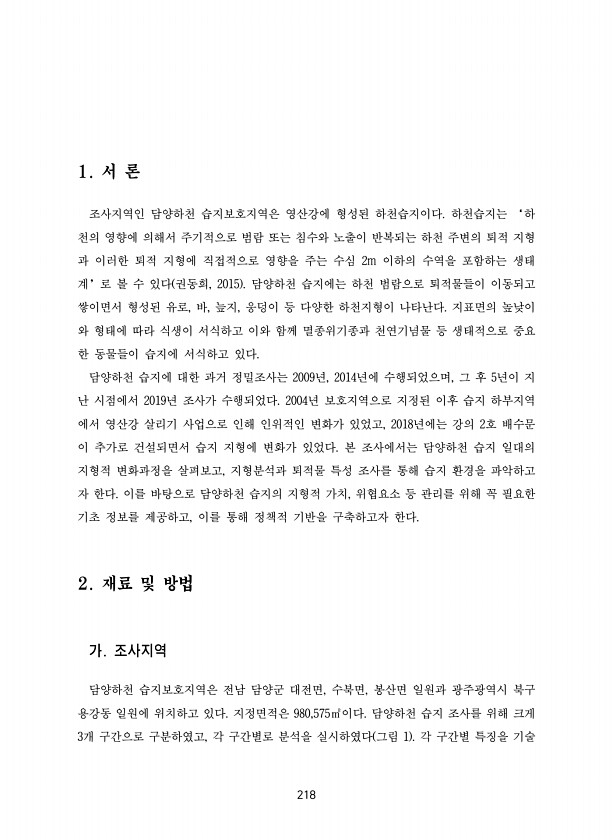 218 1. 서 론 조사지역인 담양하천 습지보호지역은 영산강에 형성된 하천습지이다. 하천습지는 ‘하 천의 영향에 의해서 주기적으로 범람 또는 침수와 노출이 반복되는 하천 주변의 퇴적 지형 과 이러한 퇴적 지형에 직접적으로 영향을 주는 수심 2m 이하의 수역을 포함하는 생태 계’로 볼 수 있다 권동희, 2015 담양하천 습지에는 하천 범람으로 퇴적물들이 이동되고 쌓이면서 형성된 유로, 바, 늪지, 웅덩이 등 다양한 하천지형이 나타난다. 지표면의 높낮이 와 형태에 따라 식생이 서식하고 이와 함께 멸종위기종과 천연기념물 등 생태적으로 중요 한 동물들이 습지에 서식하고 있다. 담양하천 습지에 대한 과거 정밀조사는 2009년, 2014년에 수행되었으며, 그 후 5년이 지 난 시점에서 2019년 조사가 수행되었다. 2...