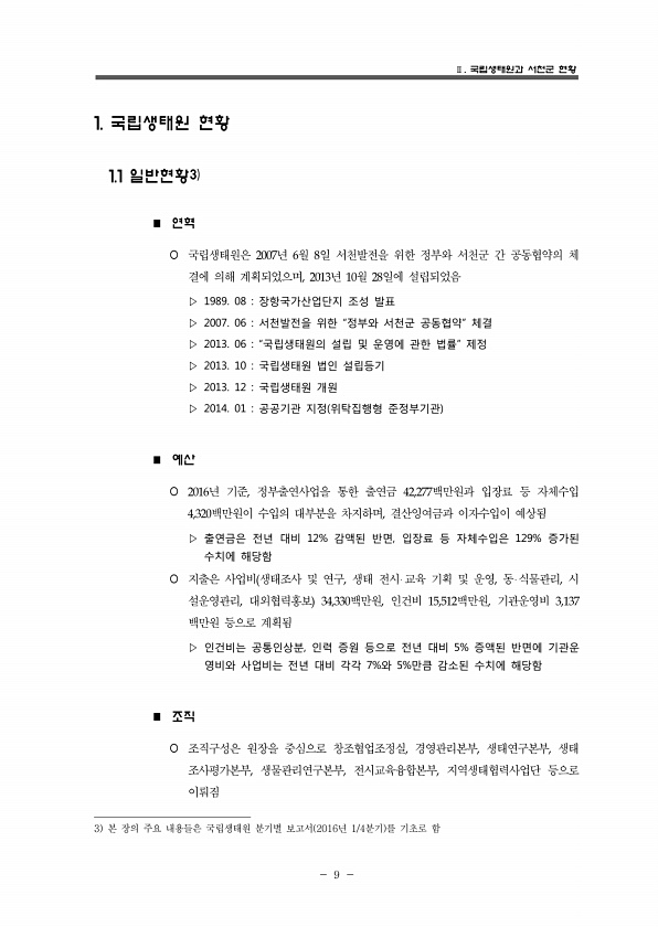 Ⅱ. 국립생태원과 서천군 현황 9 1. 국립생태원 현황 1.1 일반현황3 n 연혁 ¡ 국립생태원은 2007년 6월 8일 서천발전을 위한 정부와 서천군 간 공동협약의 체 결에 의해 계획되었으며, 2013년 10월 28일에 설립되었음 ▷ 1989. 08 장항국가산업단지 조성 발표 ▷ 2007. 06 서천발전을 위한 “정부와 서천군 공동협약” 체결 ▷ 2013. 06 “국립생태원의 설립 및 운영에 관한 법률” 제정 ▷ 2013. 10 국립생태원 법인 설립등기 ▷ 2013. 12 국립생태원 개원 ▷ 2014. 01 공공기관 지정 위탁집행형 준정부기관 n 예산 ¡ 2016년 기준, 정부출연사업을 통한 출연금 42,277백만원과 입장료 등 자체수입 4,320백만원이 수입의 대부분을 차지하며, 결산잉여금과 이자수입이 예...